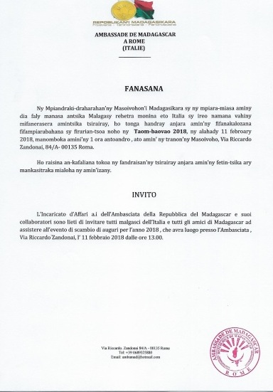 Siccome siamo già sotto Carnevale, possiamo venire mascherati, grandi e piccini, sarà ancora più divertente, come abbiamo già fatto qualche anni fa (Carnevale 2007). Poi essendo una festa di famiglia, portiamo anche qualcosa da mangiare che condividiamo nella gioia. I personali dell'ambasciata comunque ci offrira il "nofon-kena mitam-pihavanana", letteralmente la carne che mantiene il Fihavanana cioè loro ci offrirano il barbecue.